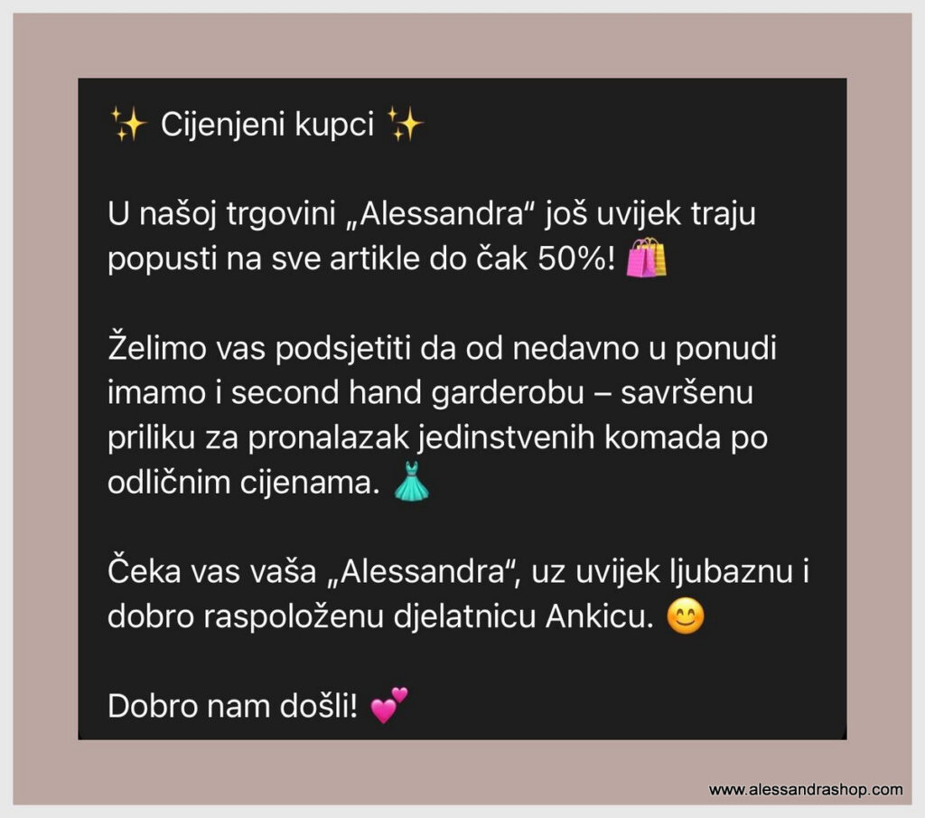 DRAGI NAŠI KUPCI-PROLJEĆE JE STIGLO A SNJIM I NAŠE NOVO RADNO VRIJEME Ponedeljak-petak;15-19 Subota:10-14 Navratite do nas-veselimo se vašem dolasku ! 14. travnja 2026.14. travnja 2026.