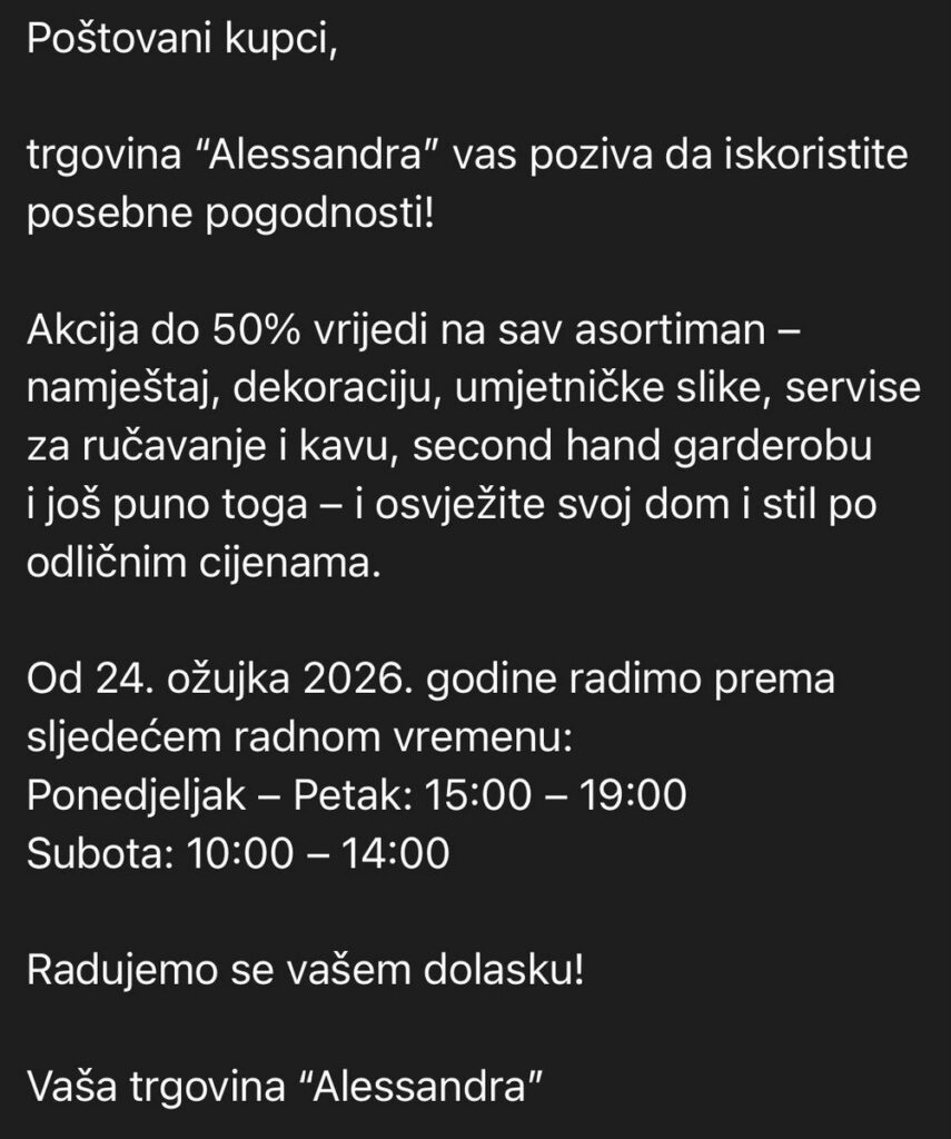"Alessandra" U TRGOVINI”ALESSANDRA”AKCIJA DO 50% KOJI VRIJEDI NA SAV ASORTIMAN "ALESSANDRA"24. ožujka 2026.13. travnja 2026.